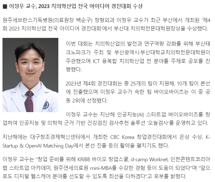 이정우 교수, 2023 치의학산업 전국 아이디어 경진대회 수상